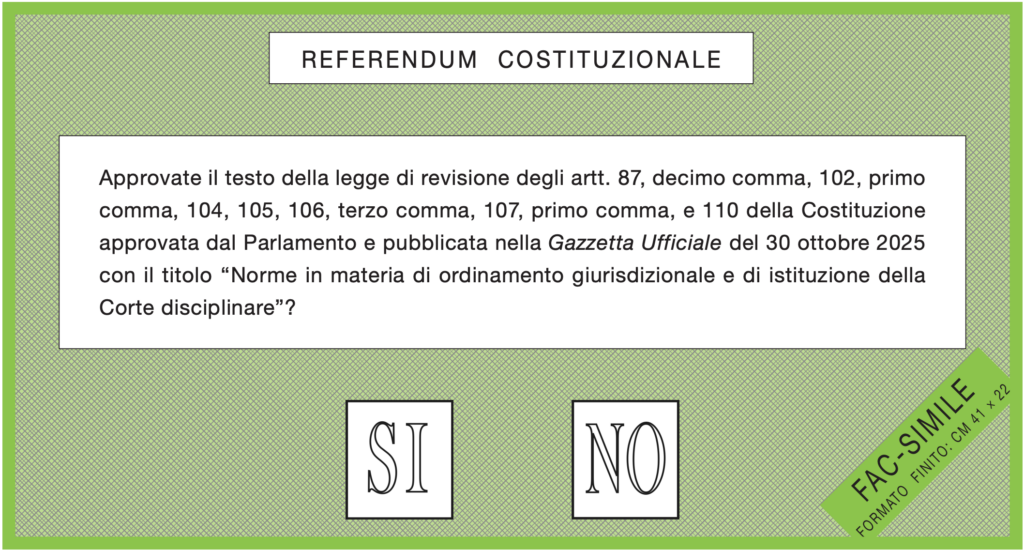«Approvate il testo della legge di revisione degli artt. 87, decimo comma, 102, primo comma, 104, 105, 106, terzo comma, 107, primo comma, e 110 della Costituzione approvata dal Parlamento e pubblicata nella Gazzetta Ufficiale del 30 ottobre 2025 con il titolo „Norme in materia di ordinamento giurisdizionale e di istituzione della Corte disciplinare“?»
