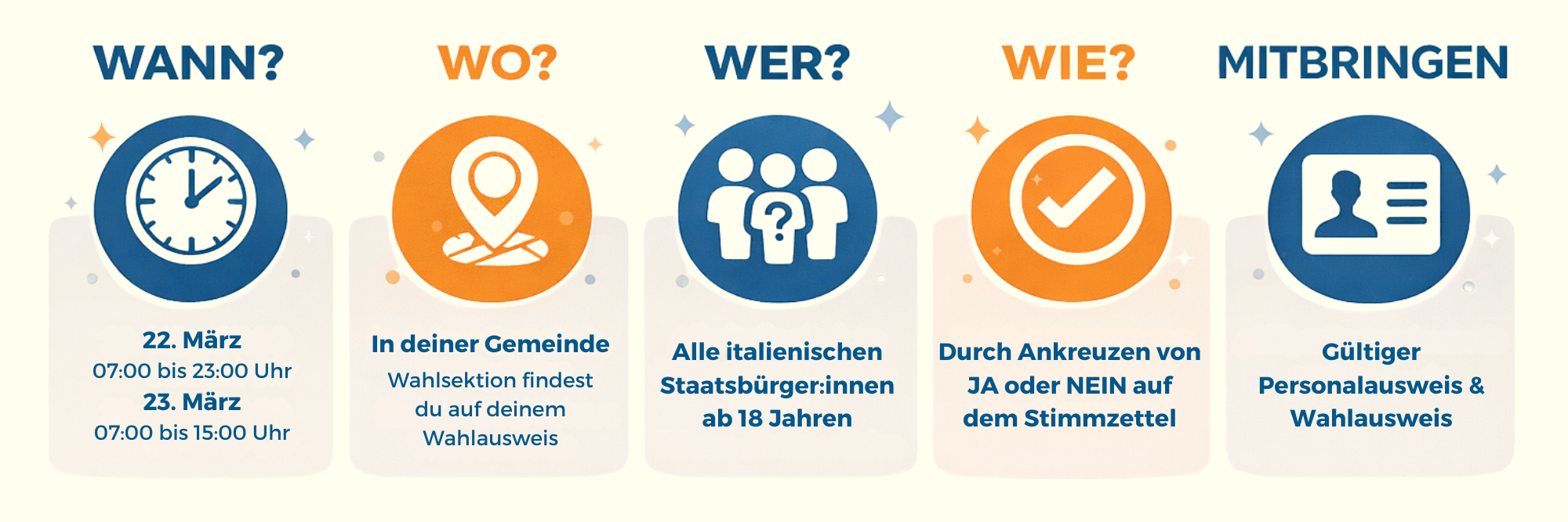 Beim sogenannten Justizreferendum stimmen alle Italienerinnen und Italiener darüber ab, ob die Laufbahn von Richter:innen und Staatsanwält:innen getrennt und damit die Verfassung geändert werden soll oder nicht.